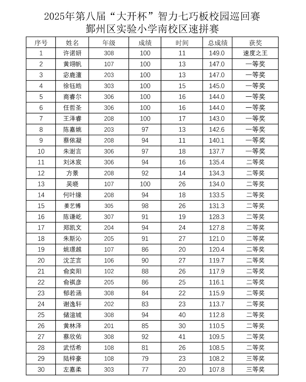 校赛获奖公布-宁波市鄞州区实验小学南校区速拼赛