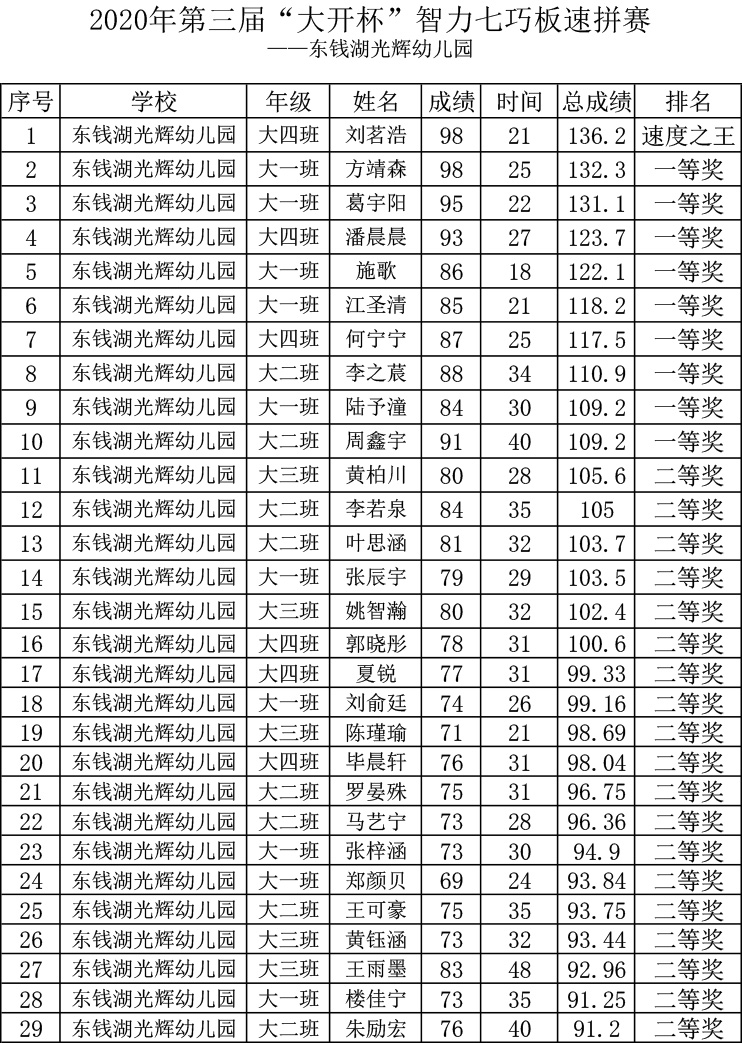 为锻炼青少年动手、动脑能力;激发科学兴趣,启迪创造意识;培养空间想象力,提高科学素质和审美能力;促进科技教育活动的普及与发展。11月25日上午,由七巧科技系列活动宁波组委会主办的2020年第三届“大开杯”智力七巧板校园巡回赛在东钱湖光辉幼儿园举行,大班小朋友参加了本次速拼赛。